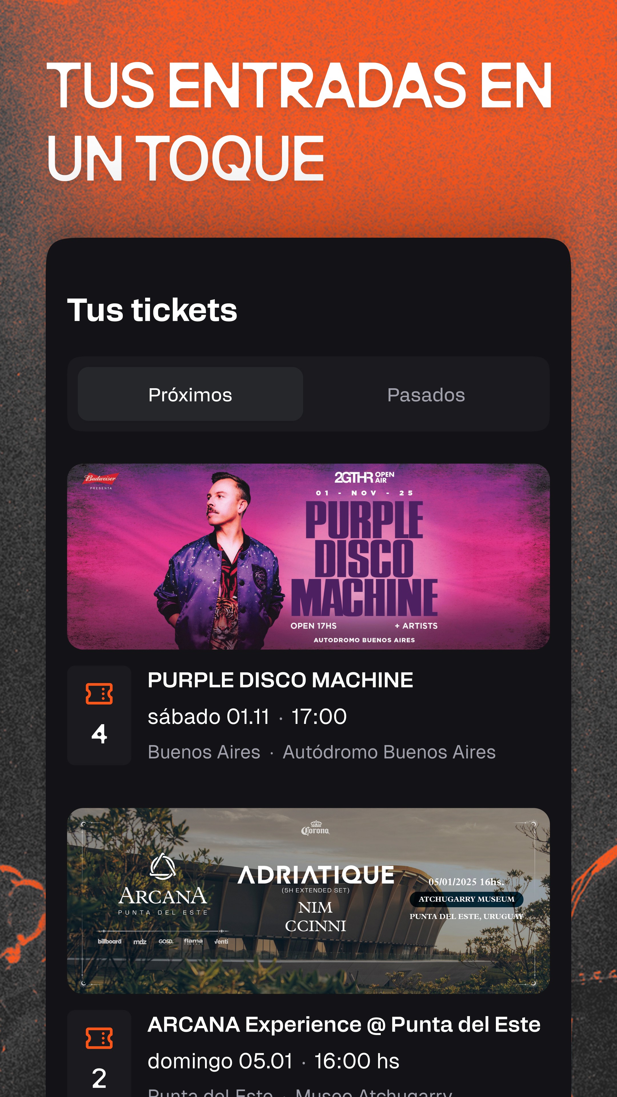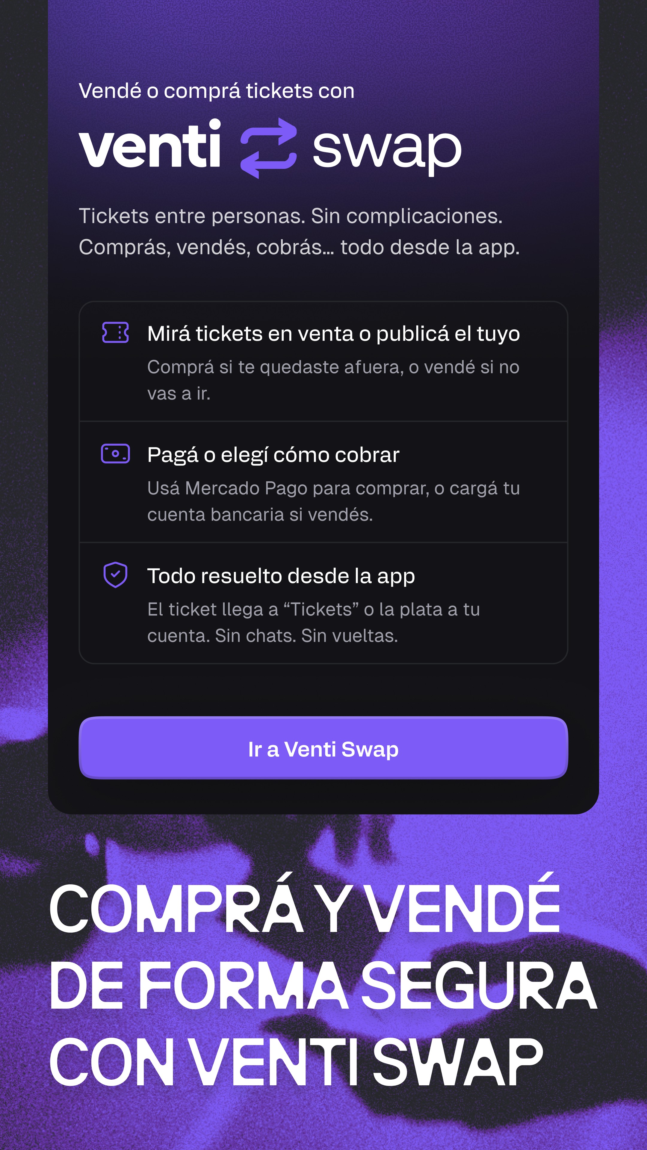 Descubrí y comprá entradas para tus eventos favoritos desde la app. Escaneá el QR y empezá a usar Venti.